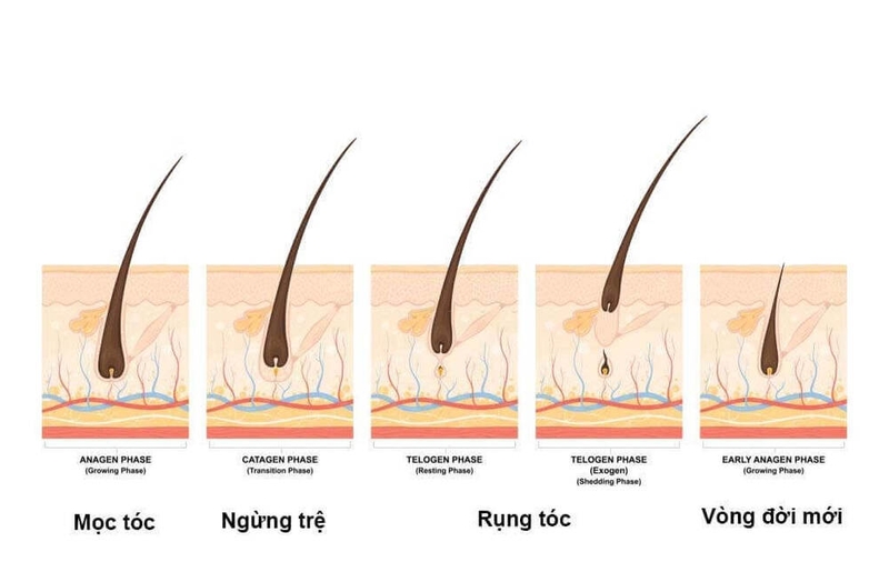 Giai đoạn catagen: Đây là giai đoạn chuyển tiếp của quá trình mọc tóc. Các nang tóc co lại khiến tóc mọc chậm lại, giai đoạn này kéo dài khoảng 10 ngày.