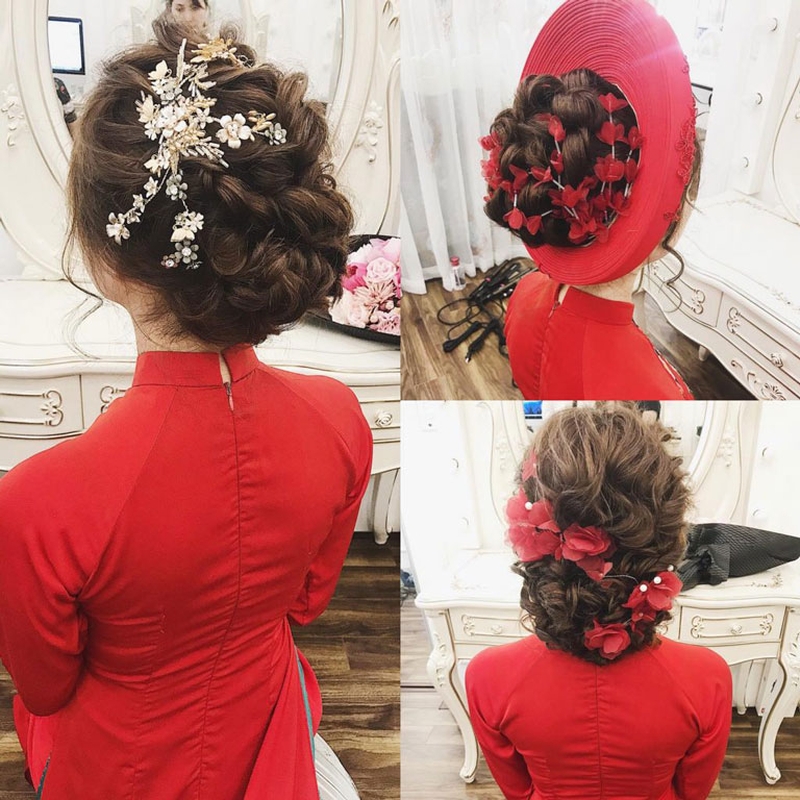 Với kiểu tóc này cô dâu sẽ cao ráo hơn và khuôn mặt nhỏ nhắn và thành tú hơn giúp giữ được bản sắc dịu dàng của người con gái Việt. Ngoài ra, bạn có thể lựa chọn kiểu buộc tóc cao, búi thấp, để mái hoặc rẽ mái tùy sở thích.