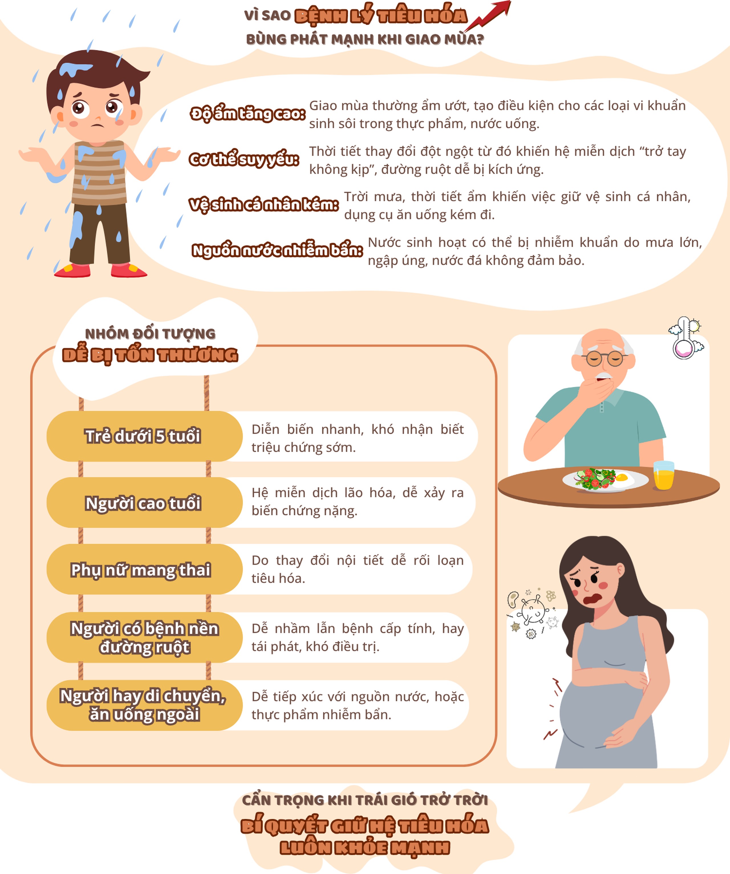 Giao mùa là thời điểm hệ tiêu hóa dễ bị tổn thương do thời tiết thay đổi thất thường, độ ẩm cao, môi trường thuận lợi cho vi khuẩn, virus phát triển. Các bệnh lý đường ruột như tiêu chảy, tả, thương hàn, ngộ độc thực phẩm có xu hướng gia tăng, đặc biệt ở trẻ nhỏ và người cao tuổi.