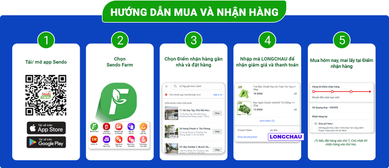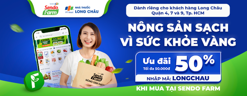 Dành riêng cho khách hàng của Long Châu tại Quận 7, Quận 4 và Quận 9, TP. HCM: mã giảm giá LONGCHAU giảm ngay 50%, tối đa 50.000 VNĐ (áp dụng từ 25.04 - 30.06.2022) khi mua nông sản sạch thông qua dịch vụ đi chợ kiểu mới Sendo Farm.