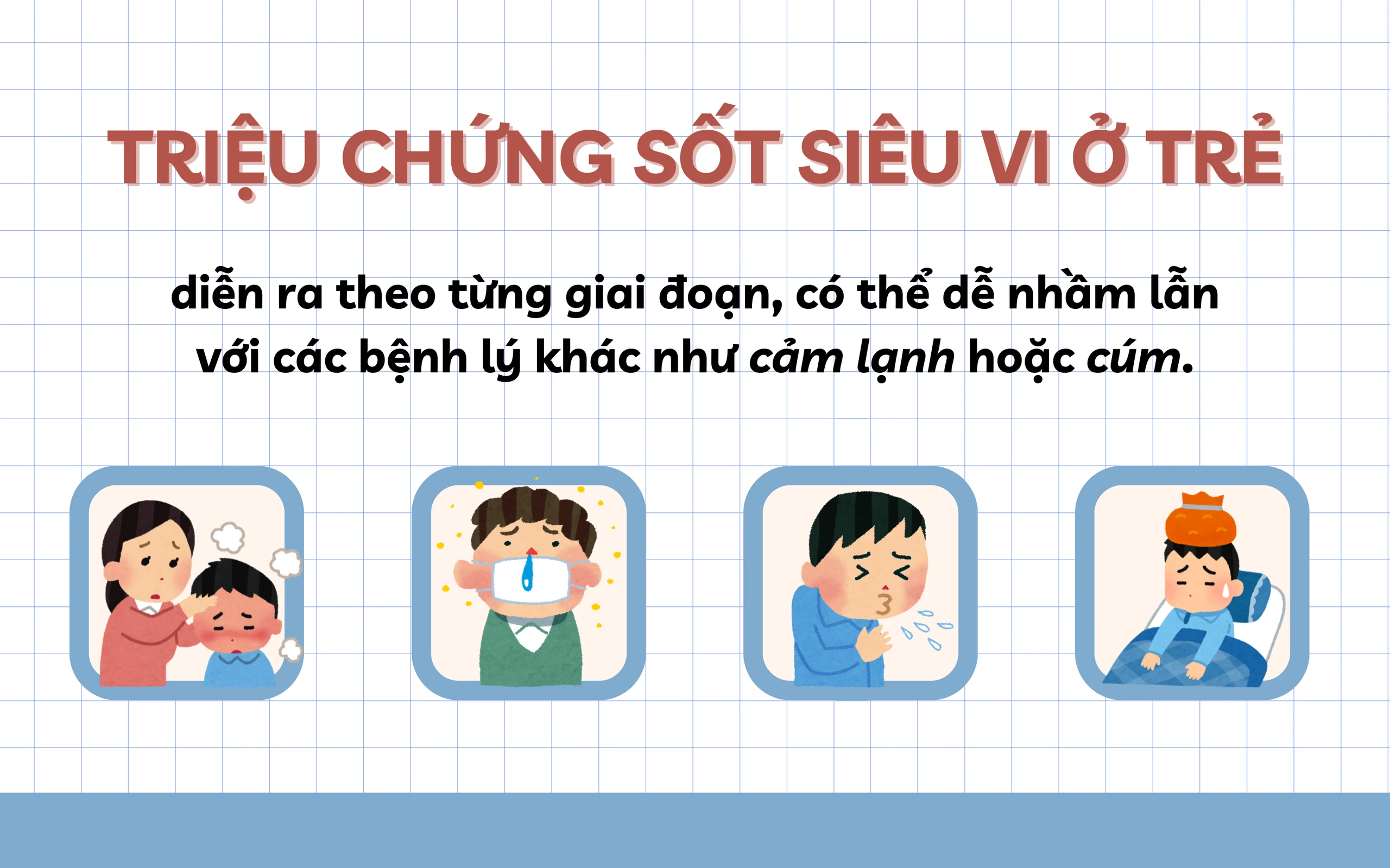 Triệu chứng sốt siêu vi ở trẻ diễn ra theo từng giai đoạn, có thể dễ nhầm lẫn với các bệnh lý khác như cảm lạnh hoặc cúm.