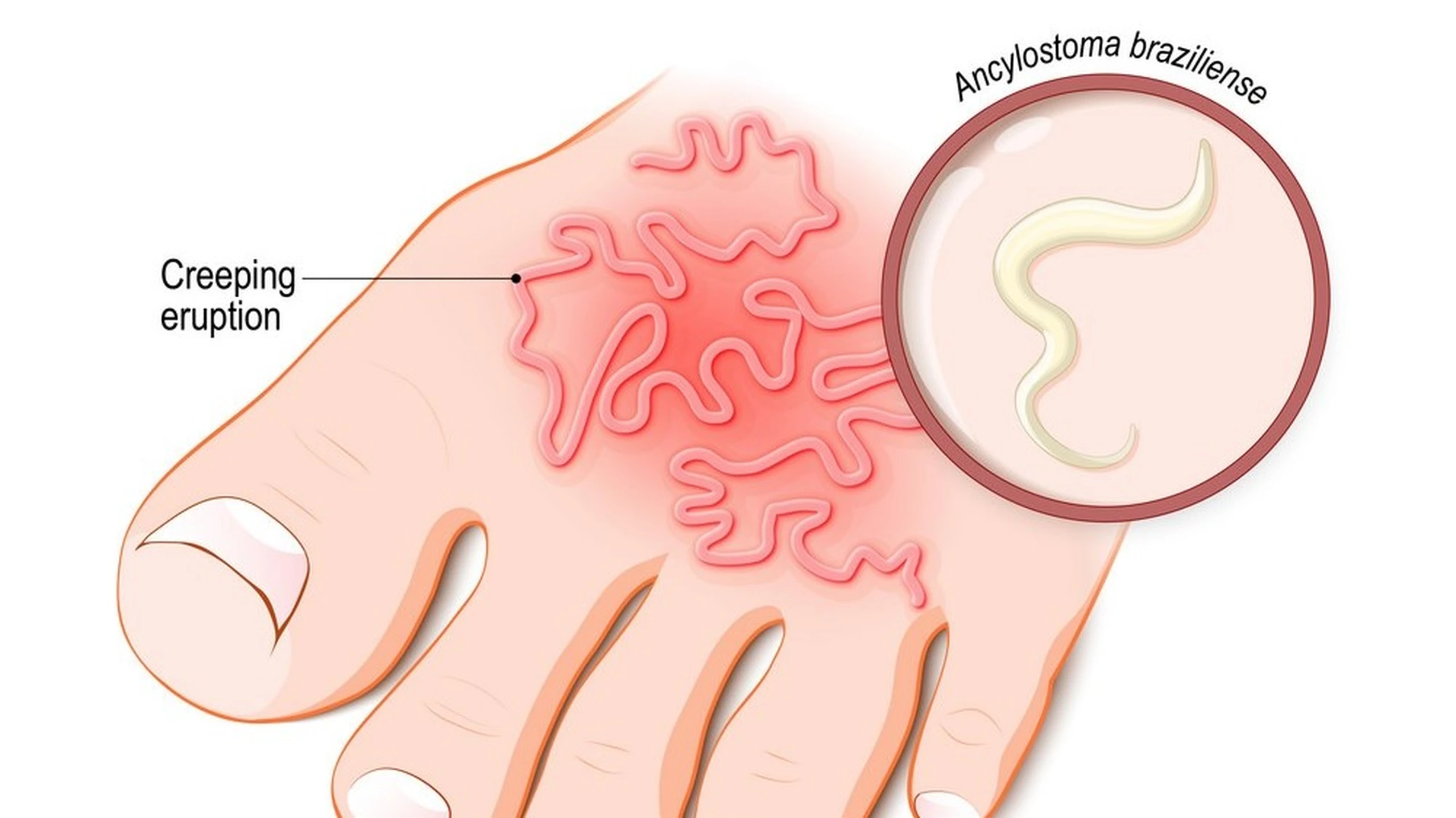 Bệnh do ấu trùng giun móc động vật gây ra, trong đó Ancylostoma Braziliense là loài thường gặp nhất ở người. Những con giun móc này thường sống trong ruột của vật nuôi trong nhà như chó, mèo và thải trứng qua phân xuống đất (thường là vùng cát của bãi biển hoặc dưới nhà). Con người bị nhiễm bệnh do tiếp xúc với đất bị ô nhiễm phân của động vật. Ấu trùng giun móc có thể chui qua lớp da nguyên vẹn nhưng vẫn bị giữ lại ở lớp hạ bì da.