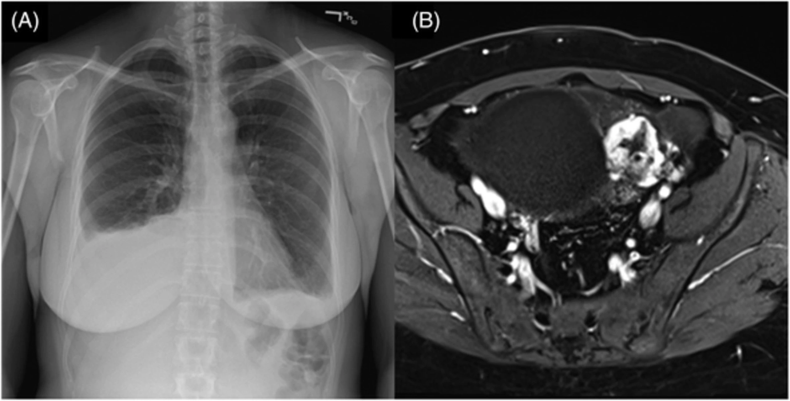 Các triệu chứng liên quan đến tràn dịch màng phổi bao gồm khó thở, ho khan và viêm màng phổi. Tràn dịch màng phổi thường ở bên phải, mặc dù có thể xảy ra tràn dịch màng phổi bên trái và hai bên. Lượng dịch của tràn dịch màng phổi không phụ thuộc vào lượng dịch cổ trướng.
