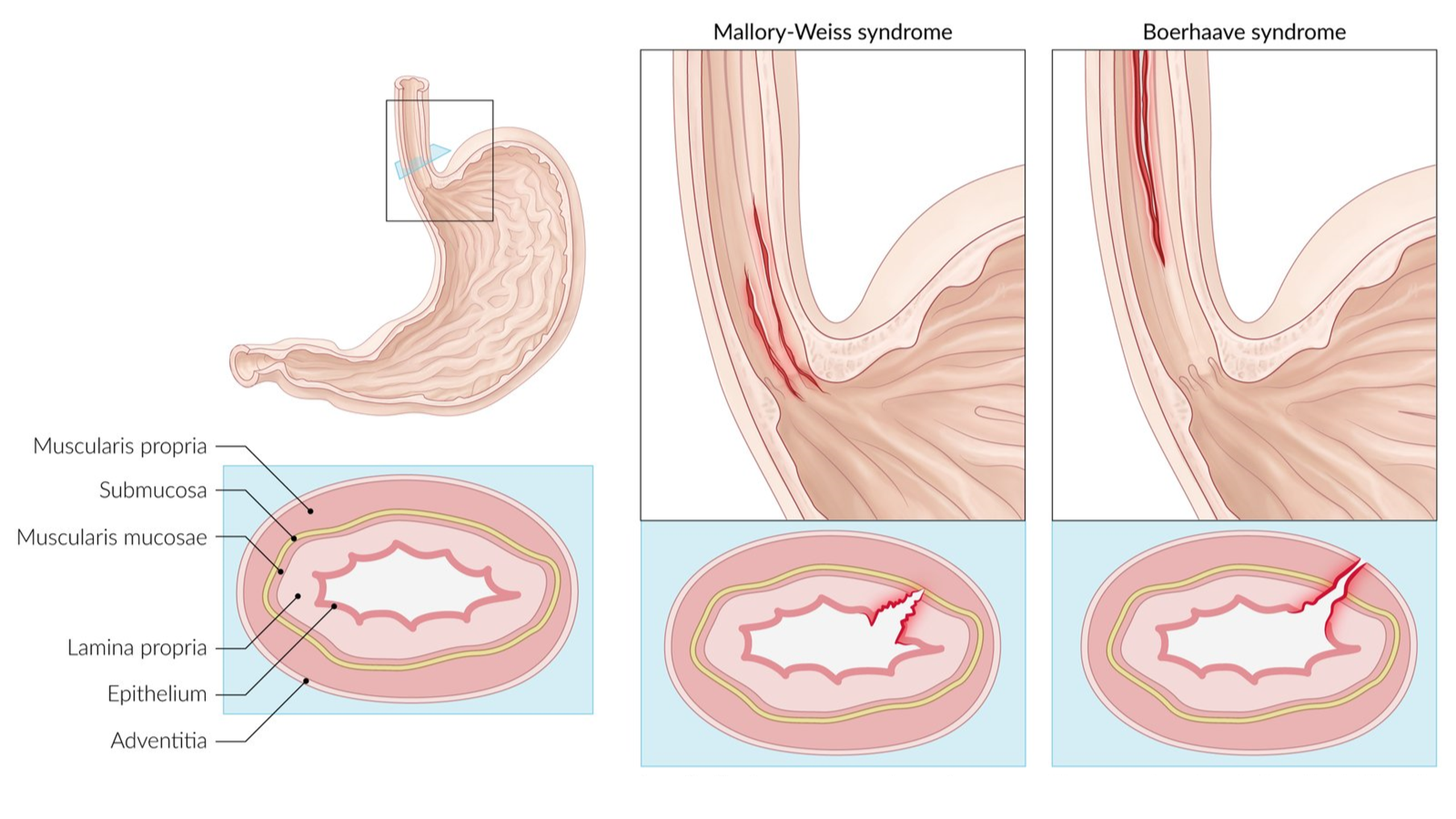 Nguyên nhân thường gặp nhất của hội chứng Mallory-Weiss là buồn nôn và nôn kéo dài. Các bệnh lý có thể dẫn đến tình trạng ho, buồn nôn và nôn kéo dài cũng dẫn đến hội chứng Mallory-Weiss, gồm: