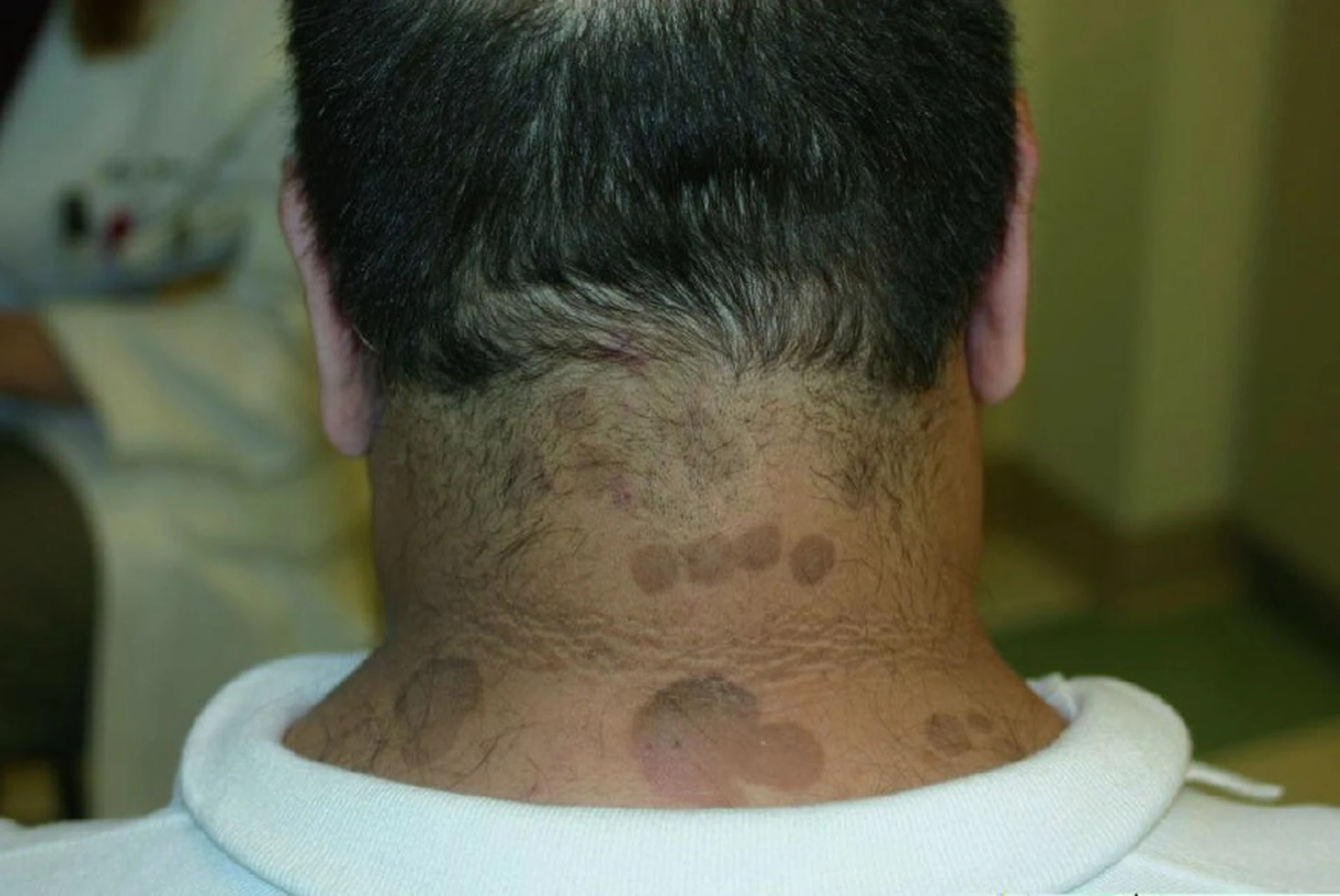 Các tổn thương lúc đầu thường nhỏ, rải rác, sau đó các dát này tập hợp lại và lan rộng dần lên. Thương tổn có hình bầu dục hoặc đa cung. Kích thước đám thương tổn có từ 1 - 3 cm đường kính. Trên tổn thương có vảy da khô nhỏ và mịn, khi cạo vảy dễ bong được gọi là dấu hiệu "vỏ bào". Nếu không được điều trị, những sắc tố đó sẽ thâm lại. Khi ra ngoài tiếp xúc với ánh nắng thì phần da tổn thương sẽ khi ra mồ hôi nhiều.