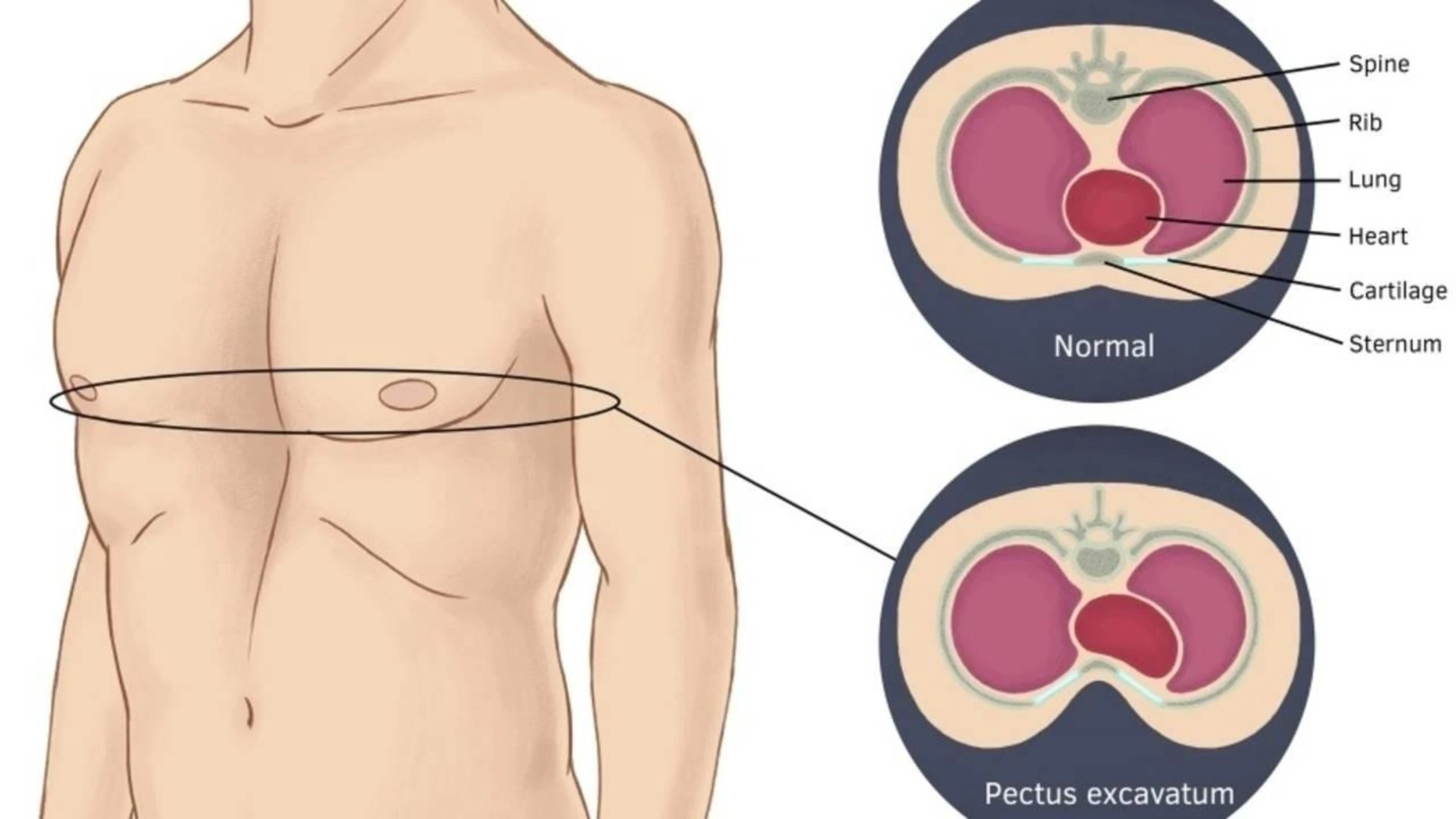 Dấu hiệu rõ nhất của bệnh là thành ngực lõm vào trong thay vì thành ngực phẳng hoặc hơi phồng ra.