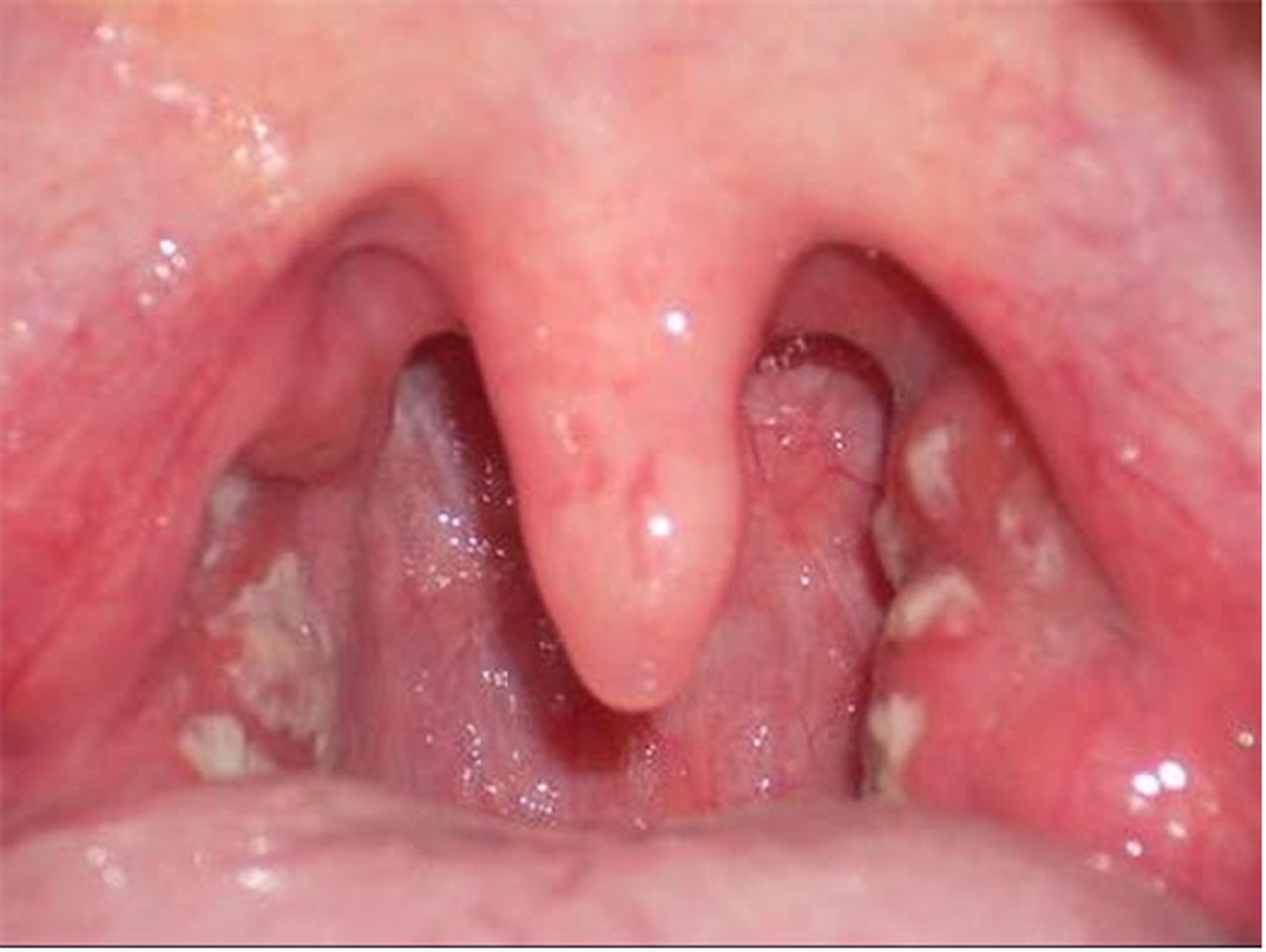 Trong cổ họng xuất hiện những mảng màu trắng có kích thước không đều;