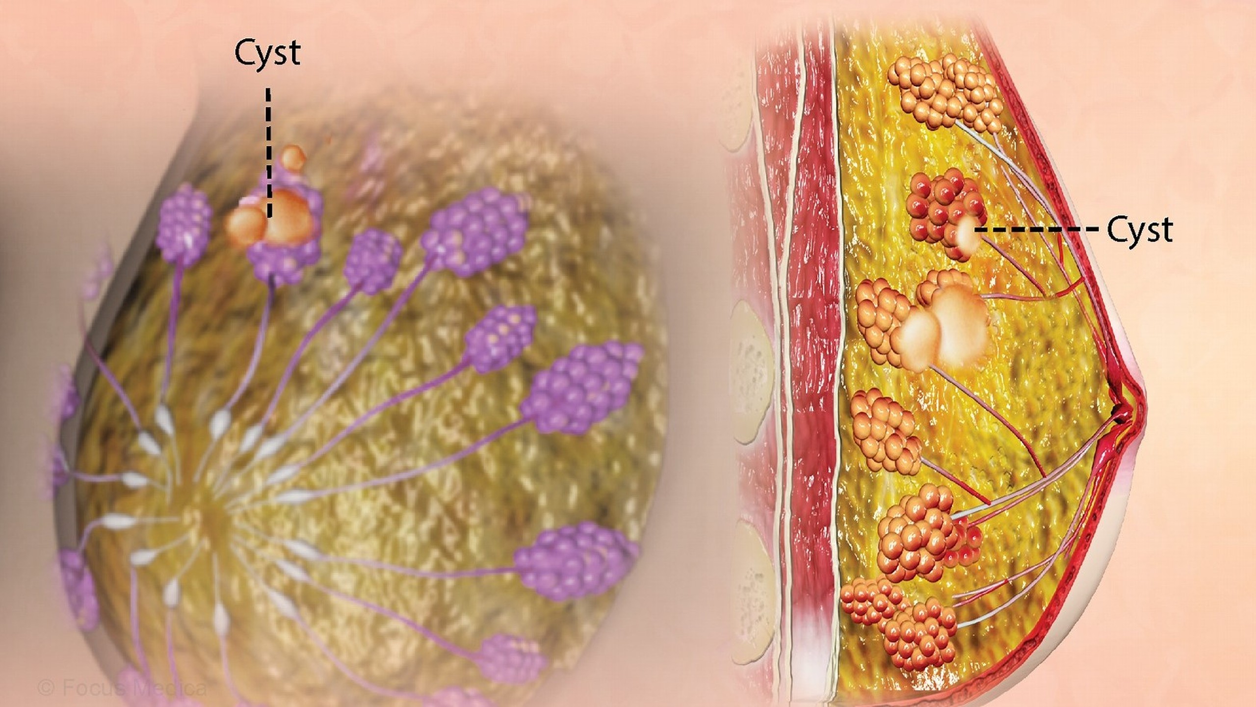 Mỗi bộ ngực chứa các thùy mô tuyến, được sắp xếp giống như những cánh hoa cúc. Các thùy được chia thành các thùy nhỏ hơn để sản xuất sữa trong thời kỳ mang thai và cho con bú. Mô hỗ trợ tạo nên hình dạng cho vú được tạo thành từ mô mỡ và mô liên kết dạng sợi. U nang vú phát triển do sự tích tụ chất lỏng bên trong các tuyến ở vú.