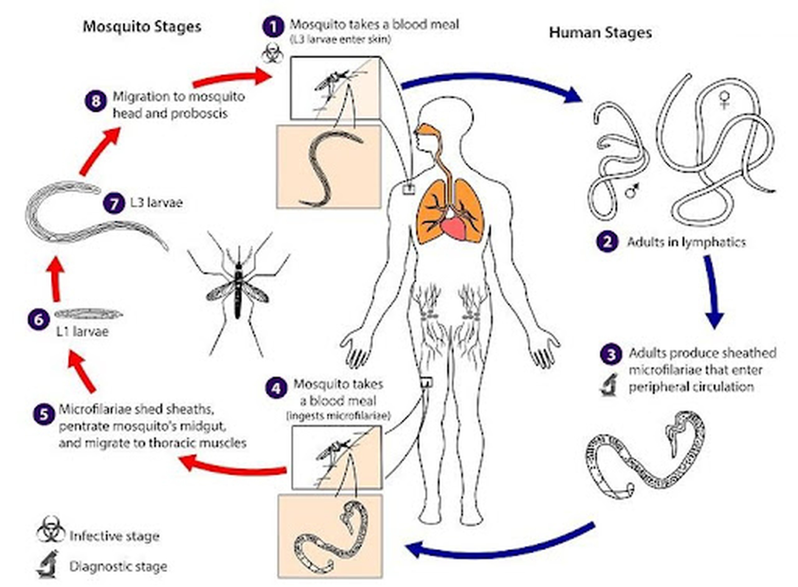 Độc tố do giun trưởng thành gây ra những biểu hiện cấp tính ở mạch bạch huyết (tỷ lệ với số giun ký sinh). Lâu ngày, các biến chứng do ngừng trệ lưu thông bạch huyết, tạo nên những tổn thương nặng hay nhẹ tùy theo số lượng giun.