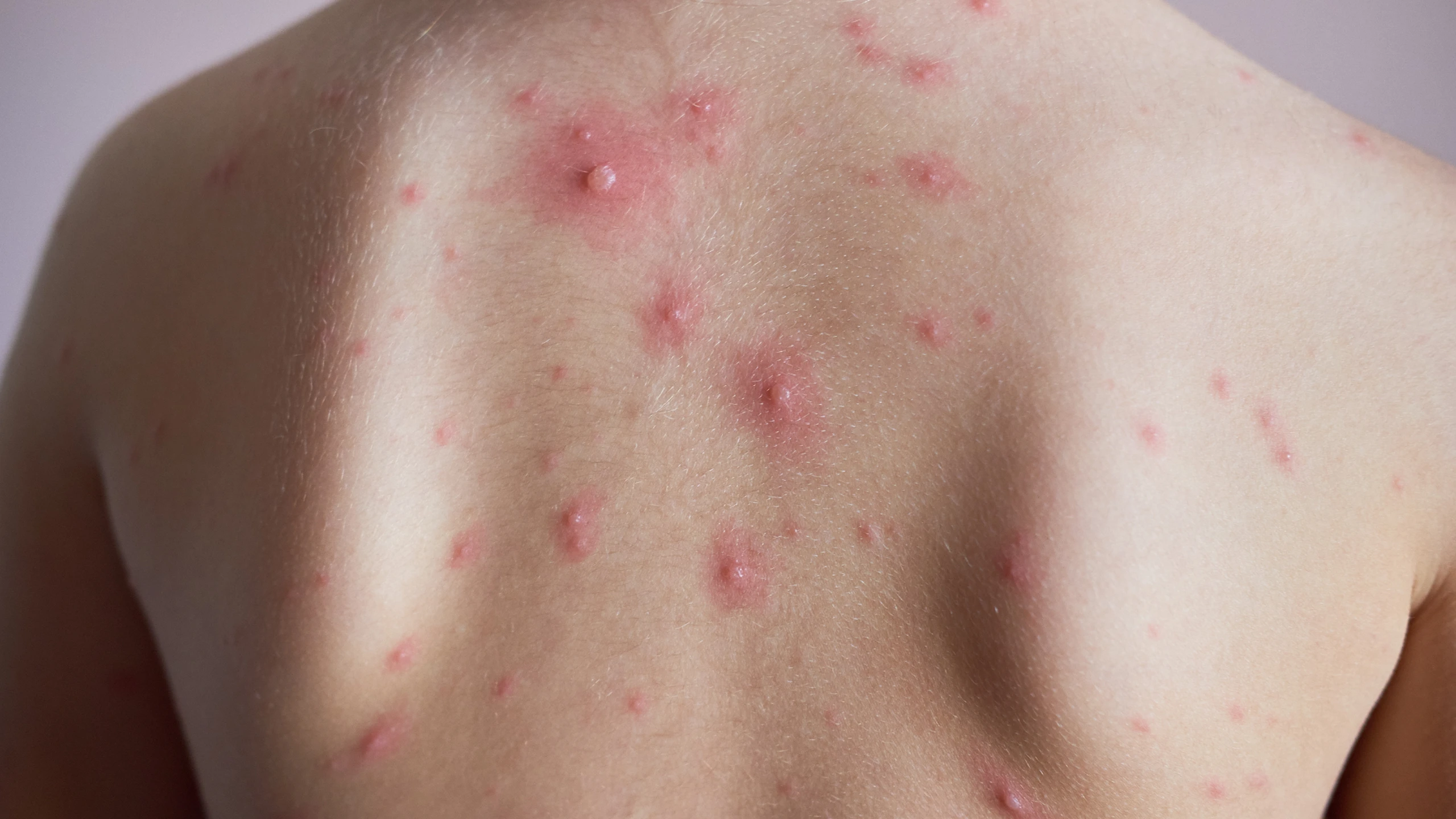 Đầu tiên là sự phát ban dạng chấm trên da rồi lan ra khắp cơ thể. Trong vòng vài giờ, các thương tổn trở thành sẩn và mụn nước màu đỏ hình thành, gây ngứa dữ dội, cuối cùng đóng vảy. Sự bùng phát ban (trong trường hợp nghiêm trọng) thường xảy ra ở phần thân mình, tứ chi, mặt (chủ yếu ở phần thân trên).