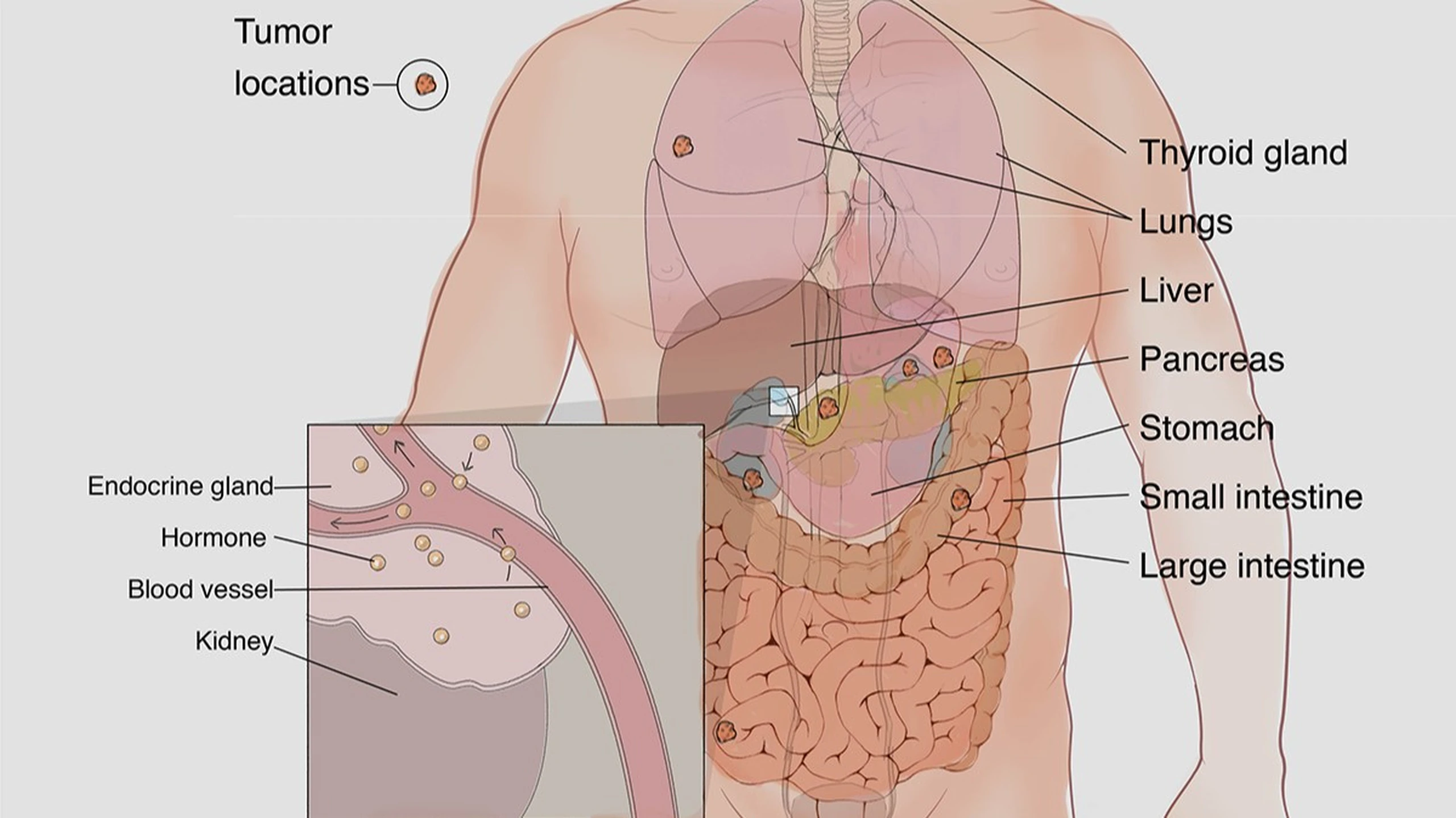 Các khối u thần kinh nội tiết phát sinh từ các tế bào sản xuất và tiết ra nhiều loại hormone được tìm thấy ở nhiều bộ phận, bao gồm: